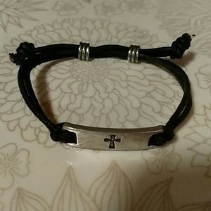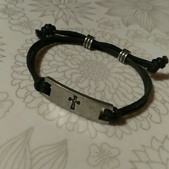 Black rope. Adjustable tightness. Silver color cross charm.