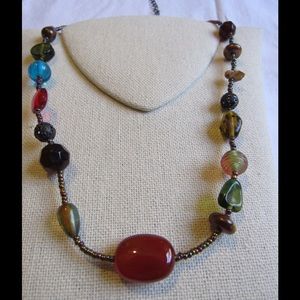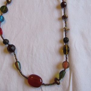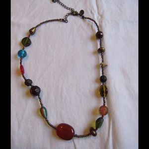 This is a multicolored adjustable length necklace by Lia Sophia. In excellent condition. Includes reds, blues, greens, and brown/bronze colors. 16-20"