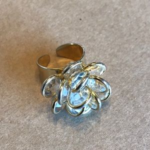 Cute adjustable ring. Currently fits roughly a size 8 , according to a printed paper sizer.