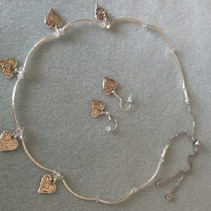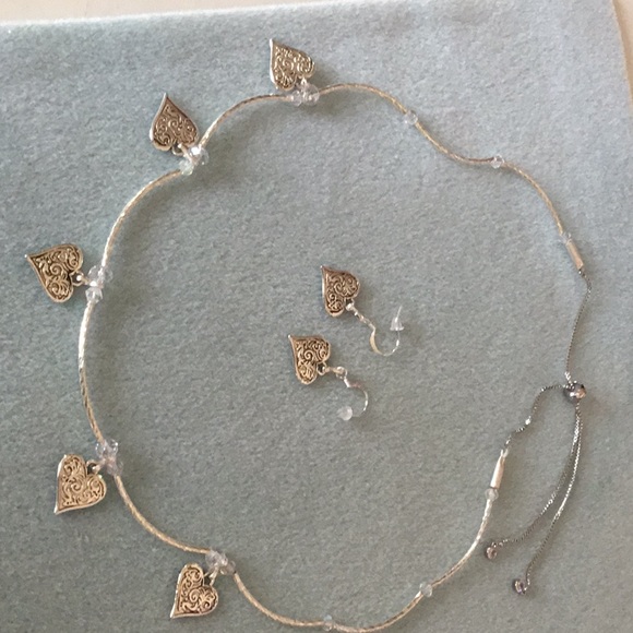 Silver adjustable necklace and earring set. Handmade silver hearts with crystal beads. Earrings silver hearts fishhook with ear stops. Adjustable neck closure