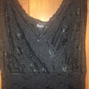 NWT cute black dress with adjustable straps and lace bodice, ties in the back