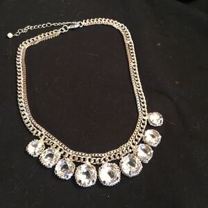 This silvertone necklace can be worn from 16” to 17 1/2” in length thanks to the extension. Chains measure 1/2” in width. Clear crystals in three sizes are bezel set and range from 1/2” to 3/4” in width. Classic accent to any formal occasion.