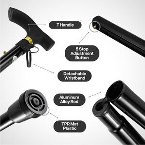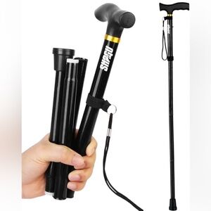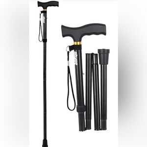 Brand new lightweight aluminum foldable cane with 5 levels of adjustable heights ranging from 33-37”. Strong plastic handle that is 5 inches long and an anti skid rubber base. Folds to less than 12 inches with a wristlet. Great for travel!