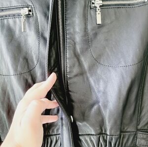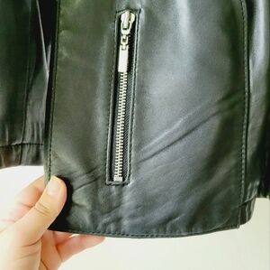 Good conditions women's leather jacket. No stains, rips or bad odors. Color black. Hoodie with faux fur. Hoodie can be detachable. Has four zip up pockets. The Lining is polyester and Rayon. This jacket is perfect for winter to pair with your favorite boots. Please see pictures for more details.