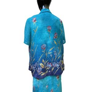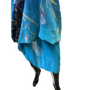 Beautiful blue Batik patterned long dress with matching jacket/blouse. The dress is sleeveless and fully lined with a zippered back. The blouse has small side slits. Size small. Measurements laying flat are pit to hem 43" and pit to pit 19" approximately. 100 percent polyester makes it easily machine washable and just hang to dry.