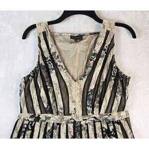 Party dress by Adolfo Dominguez. Ribbon alternates with sheer back fabric over a sloid cream lining. Elegantly cut with a full flow from the waist band. Side zipper. Very good condition, no stains or snags.