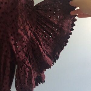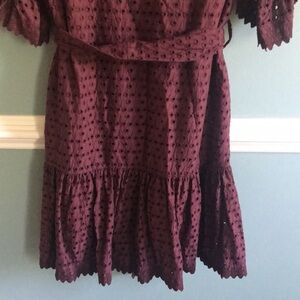 Adolfo Dominguez designer eyelet and lace plum dress. Tie waist. Feminine flirty