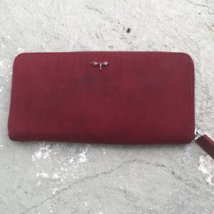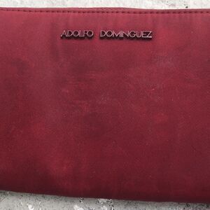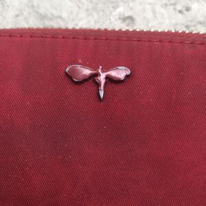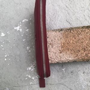 Nice zip nylon wallet holds 13 pieces of ID/credit card. Please look at the pictures exterior needs clean up which I show in the pictures. There’s approximately 8 x 4. Color is like a Burgundy red