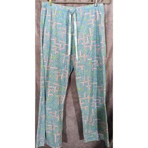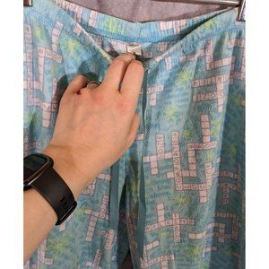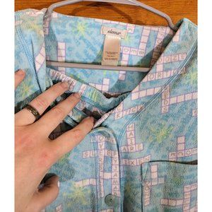 Cozy pajama set with crossword pattern. Button-up top and matching pants. Soft and comfortable fabric.