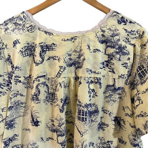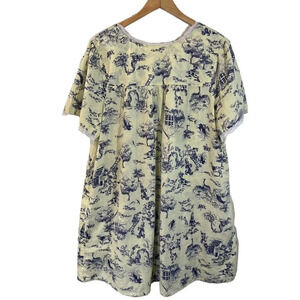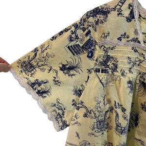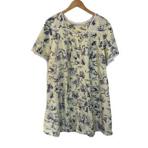 This Adonna nightgown features a refreshing yellow color with a blue novelty pattern that adds a natural touch to your sleepwear collection. The square neck and short sleeves are accented with pleats and buttons, giving it a delicate look. The lace trim adds a touch of romance to the dress, making it flowy and lightweight, perfect for summer or spring. The dress is perfect for female nature enthusiasts who would love to wear clothing that reflects their love for nature.Ideal for women, this dress is versatile and can be worn for sleepwear or lounging around.