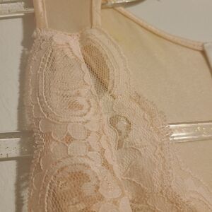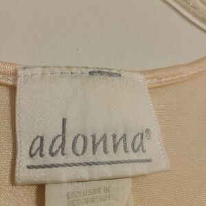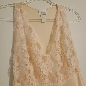 Pale peach, half lace, v-neck, sleeveless slip dress by Adonna, size medium. Can be worn alone as lingerie or paired with a blazer or denim jacket and booties for a funky look. Nylon, lycra and spandex blend. Back is slightly racerback. Excellent pre-owned vintage condition; no flaws.