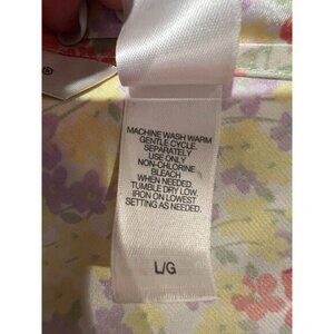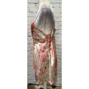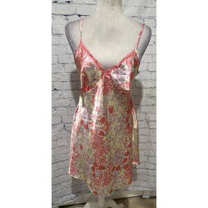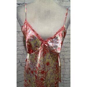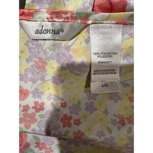 The Adonna Vintage Satin Nightgown & Robe in Pink Floral is a luxurious and elegant set for women in size Large. Made from silky polyester satin, this multicolored floral gown and robe offer a classic and feminine look perfect for a wedding or a romantic evening. The belted feature adds a touch of elegance and sophistication to this timeless set, making it a sexy and colorful addition to any woman's sleepwear collection. Ideal for those who appreciate vintage style and a touch of romance in their intimates. The gown is 19 inches pit to pit and 30 inches long while the rope is approximately 24 inches pit to pit and 38 inches long. Smoke free home.