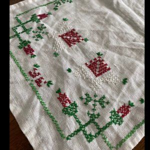 Cute linen table runner. Hand embroidered, cross-stitched) with red flowers. May have a couple of spots on them as it’s vintage. I haven’t tried to wash it. Measures 11”across by 36” long.