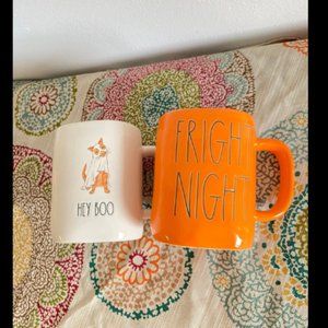 Super cute Halloween mugs! Adorable cat in ghost costume on a white mug that says “hey boo”, has orange color inside mug. Second is a solid orange mug that says “fright night” never used!
