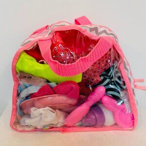 Pink and grey clear bag filled with extra doll clothes, shoes, and play accessories (variety of items — see photos)