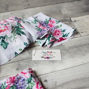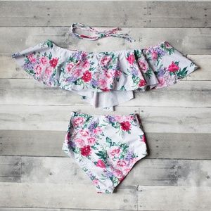 Tags: high waist swimwear swim suit wear swimsuit summer cold off the shoulder style ruffled floral flower print pink white boho bohemian beachwear ruffle