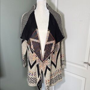 Adora Open Front Cardigan Sweater Jacket Black Beige Aztec Boho Tribal Size M