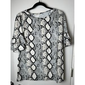 Adora boutique brand snake, skin, black and white T-shirt with ruffle sleeves. Size large.