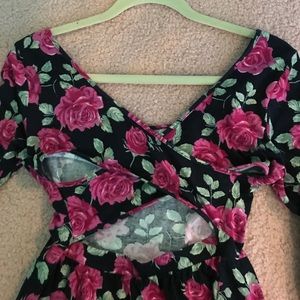 Adorable dress ft. floral print, elasticized waist, and cross-cross back. Just worn once and in perfect condition! Cotton/spandex. Pink and green flowers on navy background. Size Medium.