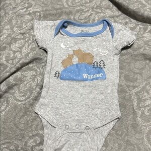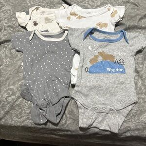 Set of cute baby onesies featuring animal prints. Includes gray and white colors with charming designs.