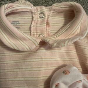 Set of two baby rompers. One with pink stripes and one with cute floral pattern. Perfect for any occasion.