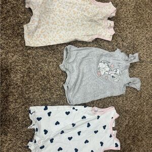 Set of three baby rompers with cute designs. Includes a gray romper with a playful print, a white romper with navy heart patterns, and a cream romper with a subtle animal print. 101 Dalmatians Disney, and other brands