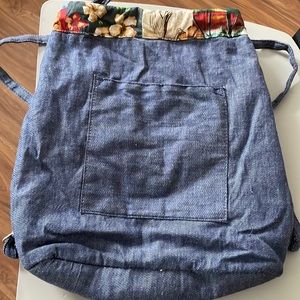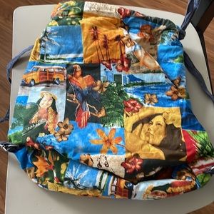 Adorable reversible blue denim backpack reverses to colorful Hawaiian print. Perfect for Summer