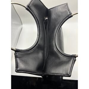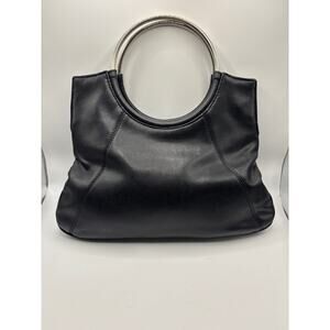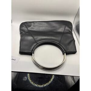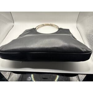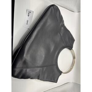Super cute black clutch with Silver metal round handles. Inside of the bag looks unused, and has a zipper closure. This is a great clutch for going out on the town when you don't need to bring something too big or heavy. It is only about one inch wide, so it is not meant for a heavy bag. This is sleek and stylish. Cannot find a material slip so would assume fake leather, but it feels real.