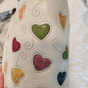 This is a well-loved Brighton handbag with adorable multicolored hearts on the side. The white leather is a little bit yellowed and the bag has scuffs on it. It is still beyond adorable. Too small for my current needs.