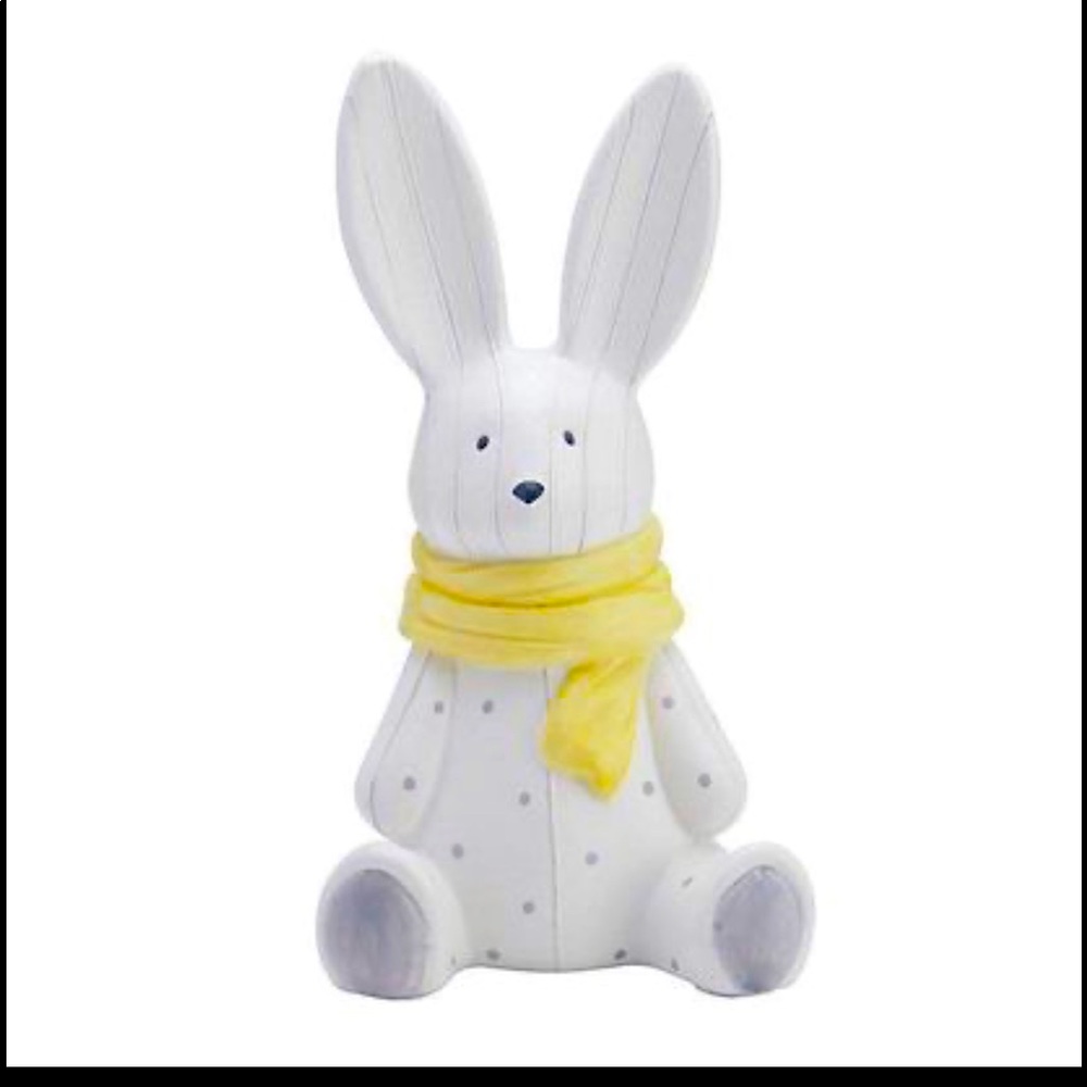 Add a sweet keepsake to your child’s room with the bunny piggy bank by elements. Crafted of ceramic, this adorable polkadot bunny is wearing a fun yellow scarf, sure to give any room a whimsical touch. Measures 5.75 inches long by 4.72 inch wide by 10 inch high brand new