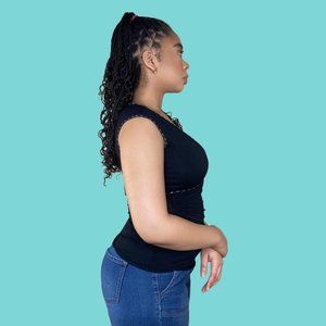 Condition: Pre-owned, good. Brand~ Max Studio, Size: xs, stretchy, ruching on the side, and wavy trim details throughout. Measurements: pit to pit: 18", waist: 24", length: 23."
