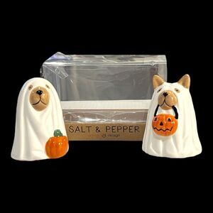 Add a dash of spooky sweetness to your Halloween setup with this adorable ceramic salt and pepper shaker set featuring two dogs dressed ghosts costumes. Each pup brings its own personality, one with upright ears and a jack-o-lantern bucket, the other with droopy ears cradling a pumpkin, making them perfect for collectors and festive decorators alike. Their size makes them perfect decor for small spaces, such as book shelves, desks, coffee bars, tiered tray displays. One dog holds a jack-o-lantern bucket; the other cradles a pumpkin