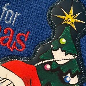 Bright plastic patch is sewn on and the wording "Yeti for Christmas" is embroidered in red and white across the rich blue knitted sweater.