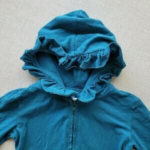 Adorable Essentials Ruffle Hooded Jacket, size 2T. Jersey material. Teal color. Missing some stitches on the ruffle of the hood. Minimal washwear/fade.
