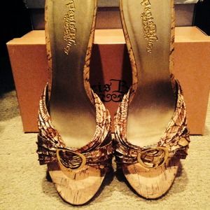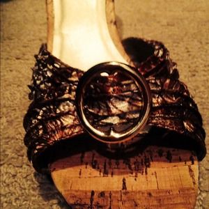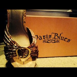9m Paris Blue: Jasmine w/ brown & gold floral print fabric! Has gold circle embellishment🍁🍂 only worn 2 times!! Scuff on back of heel😥 but in great condition😆
