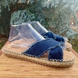 Adorable Frayed Blue Demin Crisscross Strap Flat Espadrille Slide Sandals. 8.5
