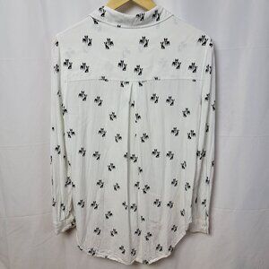 Super cute French Bulldog button front shirt. We think it's from Jane & Delancy, but the maker's tag and original sizing are no longer attached.