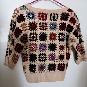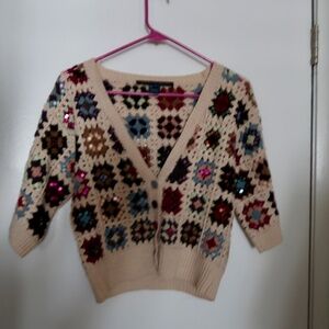 Super sweet cropped cardigan from French connection. Features multicolor crochet granny squares with sequin details, 1/2 sleeve and button front closure. Made of 100% lambswool.