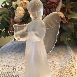 A really pretty frosted glass tree-topper angel, rich in detail and playing a harp. She's 7" tall, 4" wide, 3 1/2" deep and is as lovely as can be. She will add beauty and grace to any Christmas tree. Please see photos for details as they are part of the description.