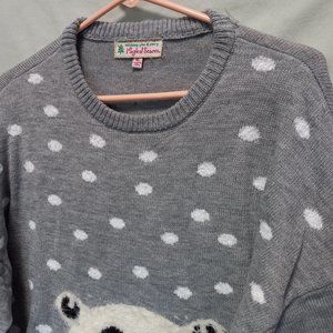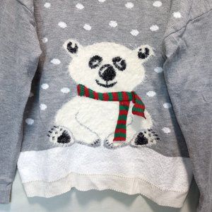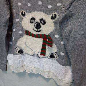 Soft gray knit with white snowflakes and a giant white fuzzy/furry polar bear on the front wearing a red and green knit scarf. There is a white kint on the botton as well as a knit trim on the hemline. Super soft and cozy.