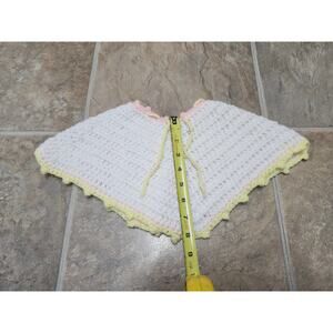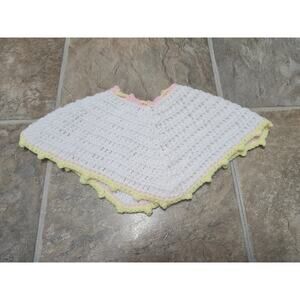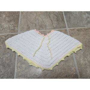 Poncho – White with pastel yellow & pink trim, tie closure at neckline.
