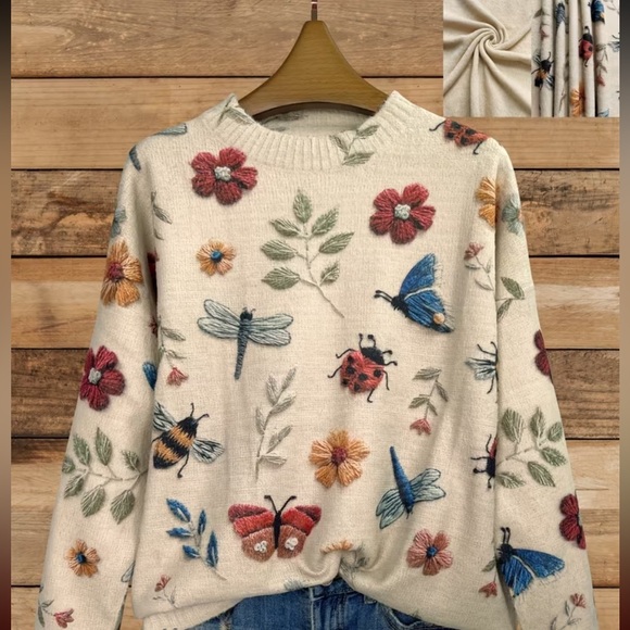 Embrace nature with this beautifully designed cream sweater featuring vibrant floral and insect patterns. Perfect for adding a touch of whimsy to your wardrobe.