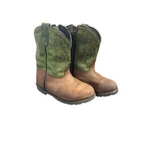 Adorable Kids' Cowboy Boots - Brown and Green Leather with Decorative Stitching