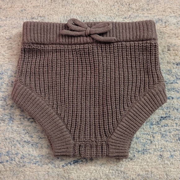 Keep your baby cozy and stylish with this adorable knit bloomer. The soft brown fabric and charming bow detail make it a perfect accessory for any outfit.