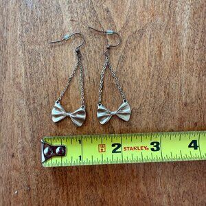 Cute gold-tone bows dangle ~2" below the ear. Gold-tone chain holds the bow in place and is secured with a gold-tone bead