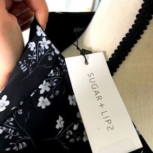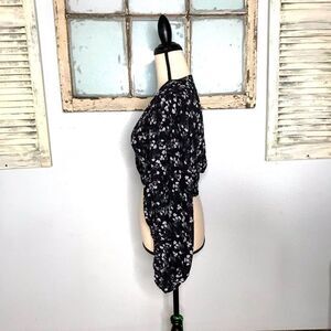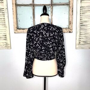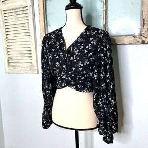 Adorable size XS long balloon sleeve crop top by Sugarlips. Black background with white floral print with v-neck opening, and knotted/wrap illusion just below the neckline. This is really a unique, but classy crop top. Almost giving a bohemian flare. It’s new with tags and has no known flaws. Comes from a smoke free home.