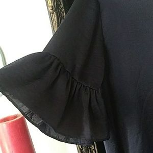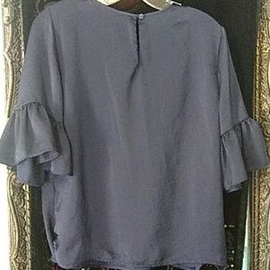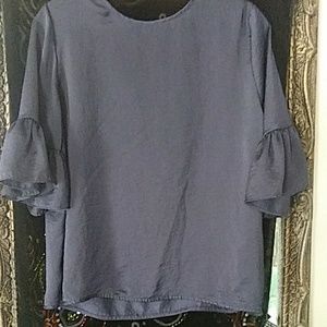 100% Polyester, feels like silk. Super soft and breezy top. 3/4 ruffle sleeves, back one button closure.