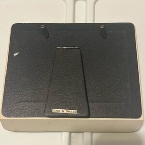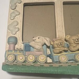 Super cute picture frame. Holds 2 pictures securely. Has raised train with bunny, bears and a giraffe along with clouds. Very whimsical! Never used.