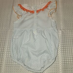 Cute baby romper with pumpkin design. Features orange and white colors.