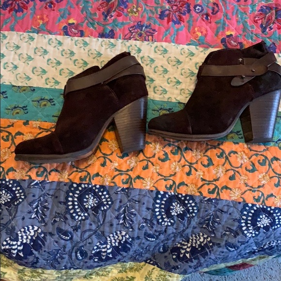 These Rag & Bone leather and suede booties are the perfect edgy addition to your wardrobe! They have been rocked quite a few times, but in very good condition. A couple very small scuffs in the leather, and spot on top of left bootie from a puddle splash, but truly not noticeable, and I think would disappear with a suede brush. Own an awesome boot from a very expensive brand at a fraction of the cost!